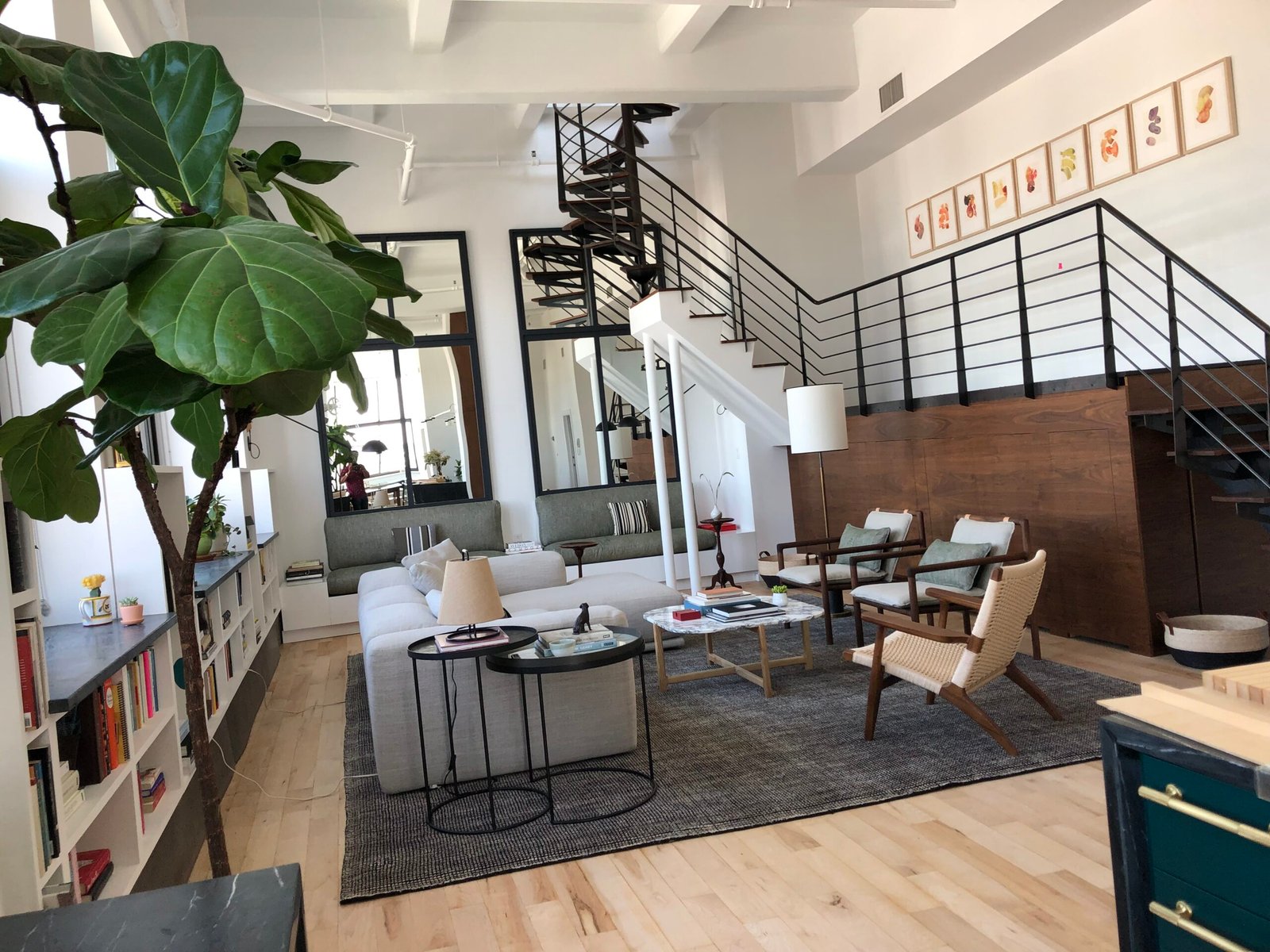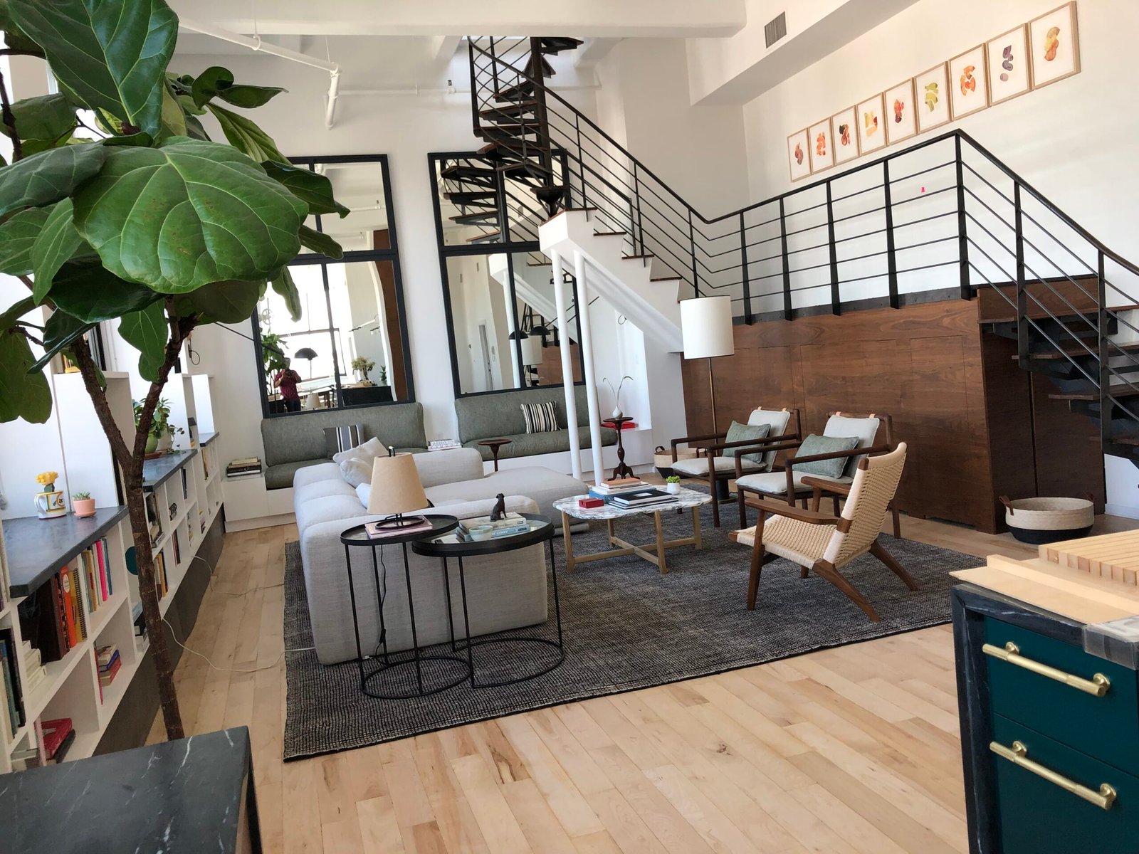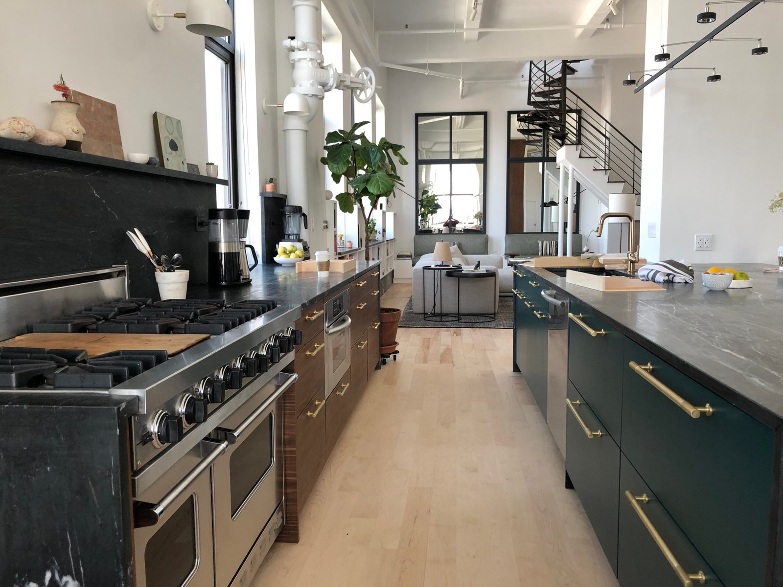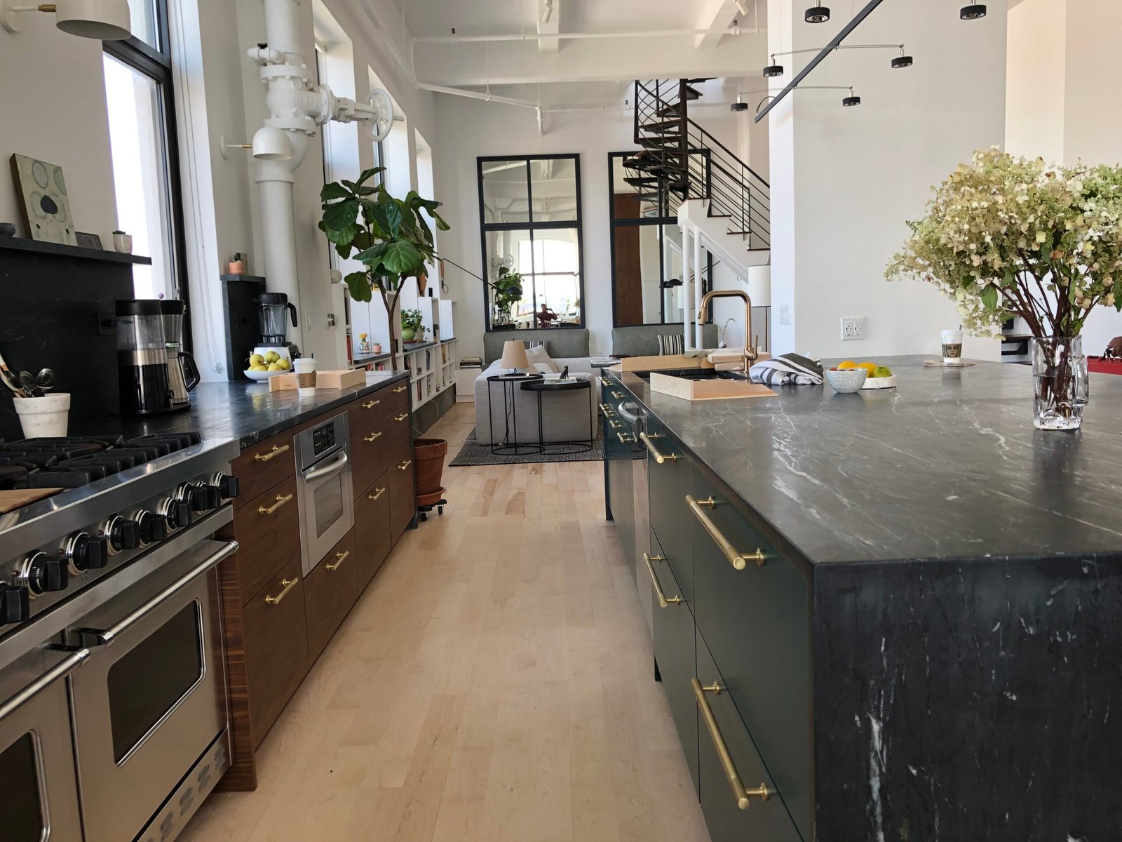 We delivered a full renovation and interior design solution that balanced preservation with modern upgrades. Original industrial elements such as exposed pipes, sprinklers, ceiling beams, and the spiral staircase were retained and highlighted to maintain authenticity. Custom mirrors were installed in the living area to reflect natural light and amplify the expansive window views. The kitchen was designed with a deep green and rich walnut palette inspired by the surrounding neighborhood’s greenery. Carefully curated furnishings were selected to keep the space minimal yet warm, allowing the blend of old and new elements to stand out. Our scope also included general contracting, concrete and masonry work, structural enhancements, and full remodeling to ensure both aesthetic appeal and long-term functionality.
