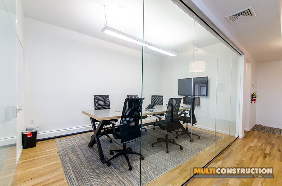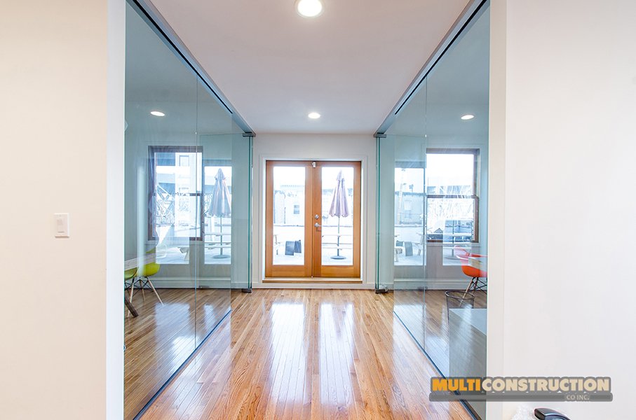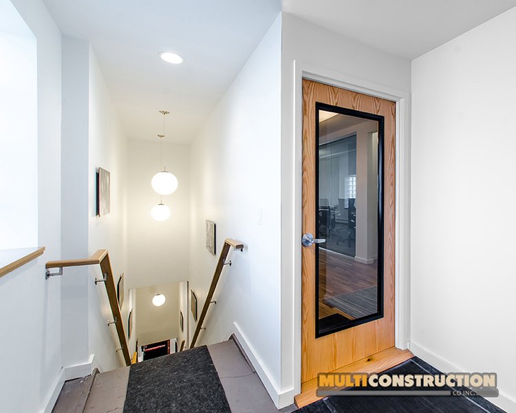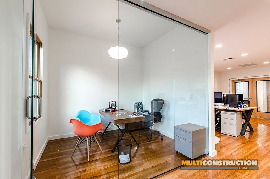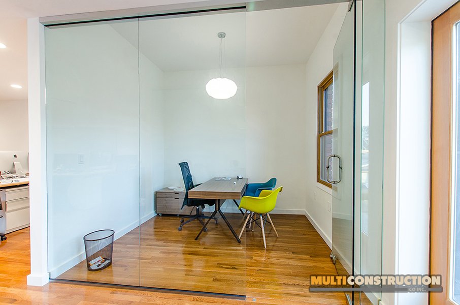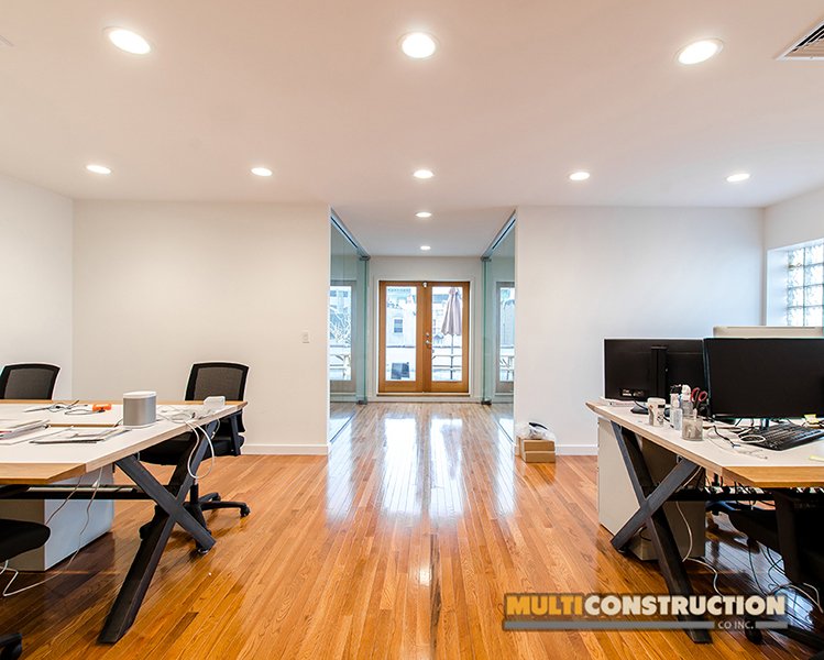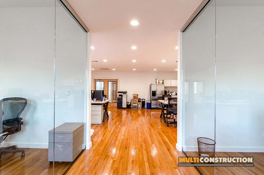 A complete renovation of a two-story corporate office, transforming the space into a modern, functional workplace with glass-partitioned rooms and upgraded interiors.